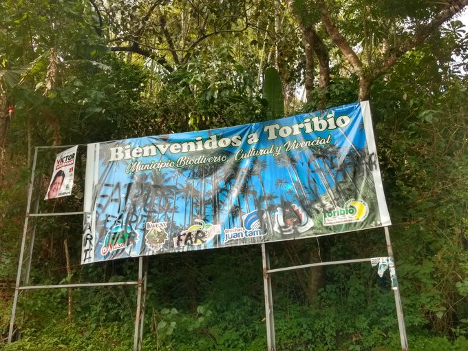 La vía a Toribío, saliendo de Santander de Quilichao, es una carretera llena de curvas en una especie de valle, rodeada por montañas verdes de la Cordillera Central por todos los lados. En la altura del corregimiento de El Palo, aun en Caloto, se empiezan ver inscripciones en rojo o negro que dicen “FARC-EP” en las placas de tránsito. Es una zona de fuerte presencia de la disidencia Dagoberto Ramos. En la entrada al municipio vecino, el letrero de “Bienvenidos a Toribio, Municipio Biodiverso, Cultural y Vivencial” y un mural del Consejo Regional Indígena del Cauca (CRIC) están grafiteados con las mismas inscripciones, en spray. La resistencia de la población también está plasmada en los muros, con intervenciones en esas letras, transformándolas en series de ochos cuadrados y otras figuras geométricas.